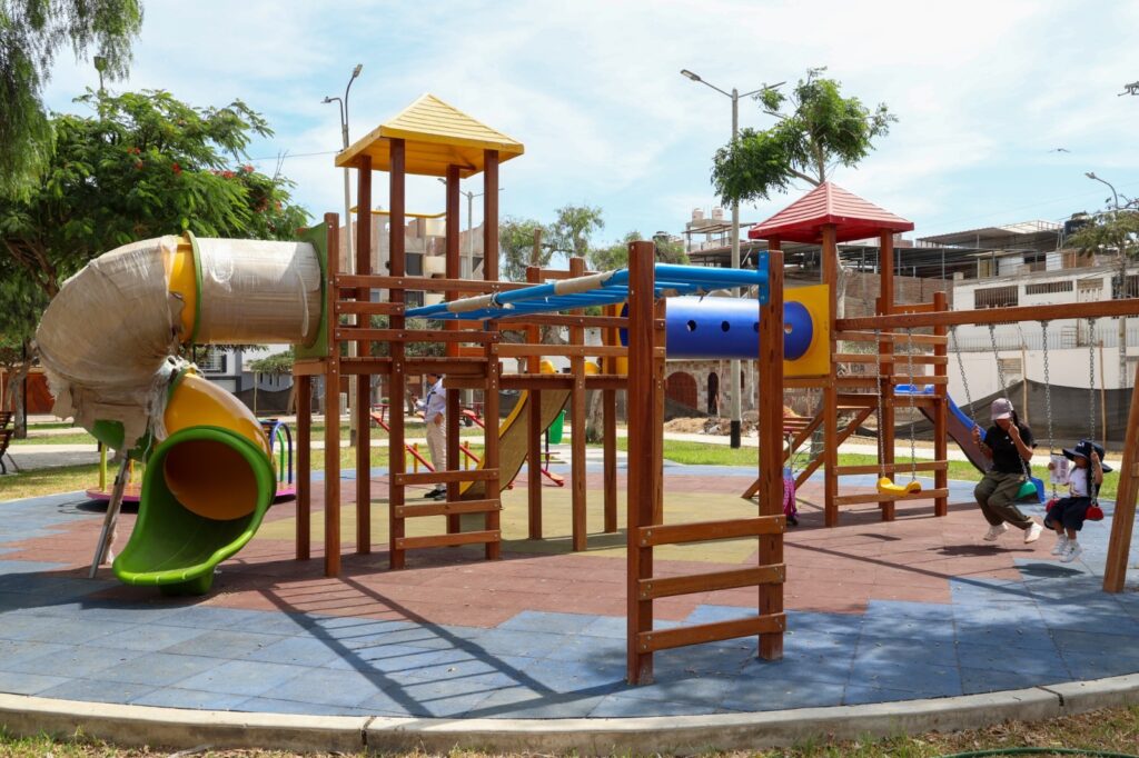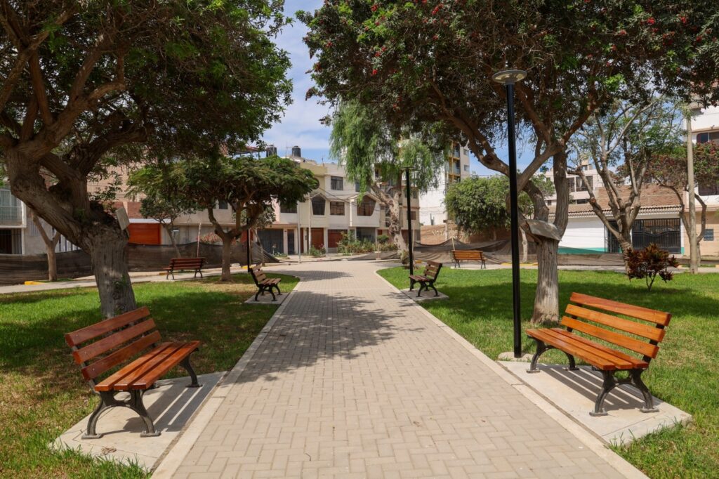 El renovado espacio público cuenta ahora con juegos infantiles, gimnasio al aire libre, bancas de madera, pérgolas, papeleras e iluminación solar. Además, se ejecutó la recuperación de áreas verdes mediante el sembrado de grass, plantas ornamentales y árboles, así como la construcción de veredas de concreto, sardineles, adoquinado en zonas de tránsito y pisos con recubrimiento de caucho.