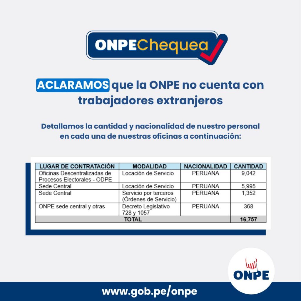 La Oficina Nacional de Procesos Electorales (ONPE) informó a la Junta Nacional de Justicia (JNJ) que no cuenta con trabajadores extranjeros dentro de su institución, precisando que la totalidad de su personal posee nacionalidad peruana.