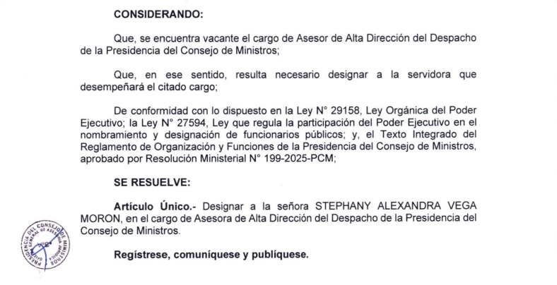La Presidencia del Consejo de Ministros (PCM) oficializó esta semana la designación de Stephany Vega Morón como Asesora de Alta Dirección del premier Ernesto Álvarez Miranda, a través de la Resolución Ministerial N.º 282-2025-PCM.
