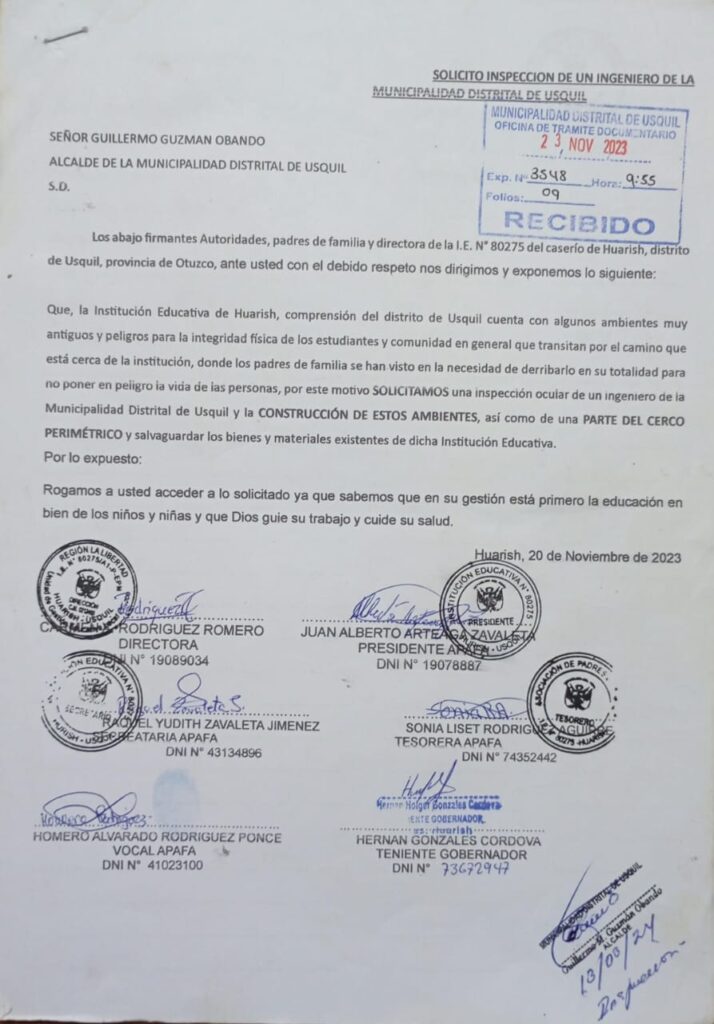 La directora Carmen Rodríguez y la APAFA iniciaron trámites en septiembre de 2023 solicitando a la Municipalidad Distrital de Usquil una inspección técnica, reforzamiento del local y construcción del cerco perimétrico. El alcalde Guillermo Guzmán y el gerente municipal Raúl Sachún se comprometieron a intervenir “de inmediato”.