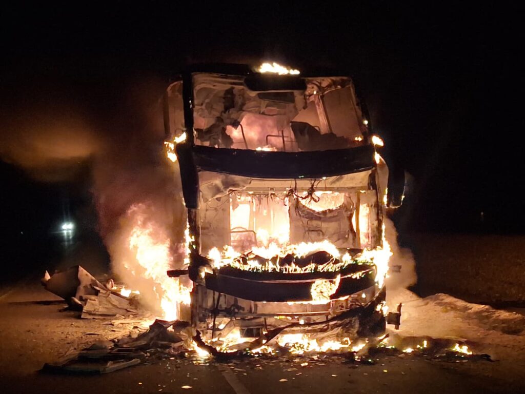 Un ómnibus interprovincial quedó completamente destruido tras incendiarse en la carretera Panamericana Norte, a la altura del sector La Arenita, en el distrito de Paiján, provincia de Ascope.