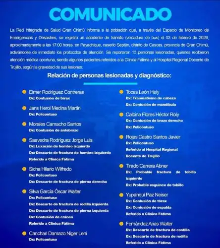 La Red de Salud de Gran Chimú brindó detalles de los heridos, quienes presentan lesiones que van desde contusiones hasta posibles fracturas, siendo atendidos en centros de salud de la zona y algunos derivados a establecimientos especializados.